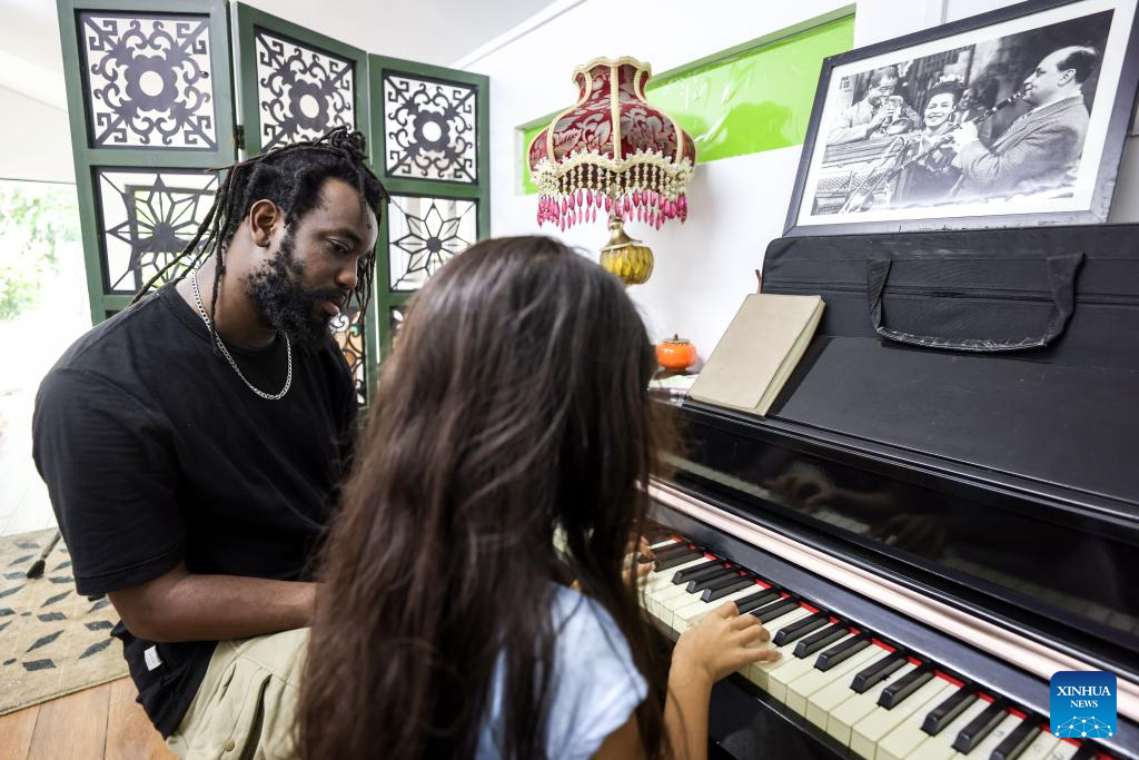 HAIKOU, 15 agosto, 2024 (Xinhua) -- Imagen del 14 de agosto de 2024 de David Mouk (i) enseñando a una niña a tocar el piano en su estudio de música, en Haikou, en la provincia de Hainan, en el sur de China. Como profesor de piano y músico de banda, David proviene de la República del Congo y ha estado viviendo en Hainan desde hace casi 10 años. Habiendo estudiado música desde la infancia, formó su propia banda mientras estaba en la universidad y luego vino aquí para realizar una maestría. El músico cree firmemente que la música es una parte indispensable de la vida y puede brindar poder a las personas. Por lo tanto fundó un estudio de música para enseñar a los niños a tocar el piano. Fuera del estudio, David toca el teclado en varias bandas. "Considero a Hainan como mi segundo hogar y deseo hacer más música hermosa aquí", dijo David. (Xinhua/Zhang Liyun)
