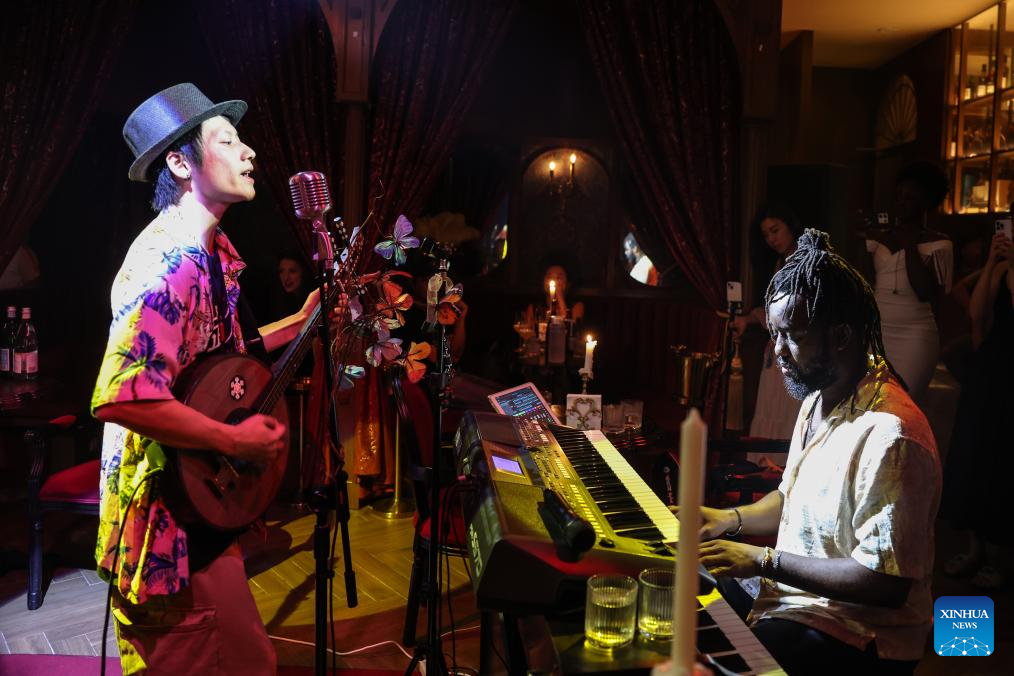 HAIKOU, 15 agosto, 2024 (Xinhua) -- Imagen del 6 de agosto de 2024 de David Mouk (d) realizando una presentación junto a un músico que toca un instrumento tradicional chino en un bar musical, en Haikou, en la provincia de Hainan, en el sur de China. Como profesor de piano y músico de banda, David proviene de la República del Congo y ha estado viviendo en Hainan desde hace casi 10 años. Habiendo estudiado música desde la infancia, formó su propia banda mientras estaba en la universidad y luego vino aquí para realizar una maestría. El músico cree firmemente que la música es una parte indispensable de la vida y puede brindar poder a las personas. Por lo tanto fundó un estudio de música para enseñar a los niños a tocar el piano. Fuera del estudio, David toca el teclado en varias bandas. "Considero a Hainan como mi segundo hogar y deseo hacer más música hermosa aquí", dijo David. (Xinhua/Zhang Liyun)