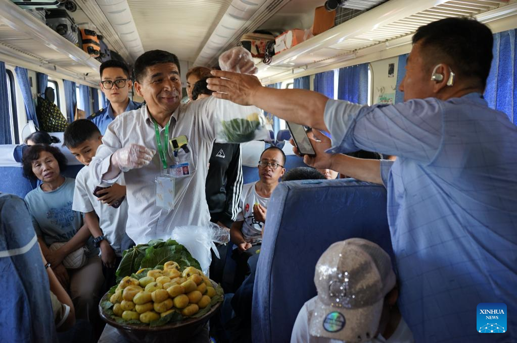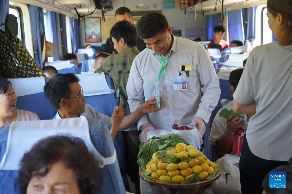URUMQI, 15 agosto, 2024 (Xinhua) -- Imagen del 1 de agosto de 2024 del comerciante Yimamamat Saipar vendiendo higos a bordo del tren número 7557. Como viajero habitual del tren, Yimamamat Saipar, oriundo de Artux, en la prefectura autónoma kirguis de Kizilsu, en la región autónoma uygur de Xinjiang, en el noroeste de China, considera que el viaje a Hotan, a más de 500 kilómetros de su casa, es convenientemente asequible con el precio del boleto de solo 57 yuanes (unos 8 dólares estadounidenses). Vendiendo las frutas que cultiva en casa, puede ganar más de 1.000 yuanes por viaje. (Xinhua/Jin Bowen)