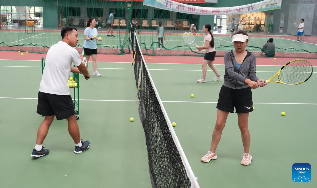 BEIJING, 15 agosto, 2024 (Xinhua) -- Imagen del 14 de agosto de 2024 de adultos estudiantes participando en una clase de tenis en un club de tenis, en Beijing, capital de China. China ha experimentado recientemente un aumento en el entusiasmo por el tenis, como lo demuestra un notable incremento en la demanda de clases de entrenamiento y reservas de canchas en varias ciudades. Este aumento se puede atribuir a la histórica victoria de la tenista china Zheng Qinwen, quien consiguió la primera medalla de oro olímpica de tenis individual de China en los Juegos Olímpicos de París. Cabe mencionar que no solo cada vez más adultos han adoptado el tenis como actividad recreativa, sino que también un número cada vez mayor de padres han inscrito a sus hijos en cursos de entrenamiento de tenis, buscando transmitirles la alegría del deporte. Este creciente interés por el tenis ha llevado a un aumento correspondiente en el número de canchas de tenis y entrenadores disponibles. Estas tendencias demuestran claramente la creciente popularidad del tenis entre los entusiastas del deporte chino. (Xinhua/Cai Yang)
