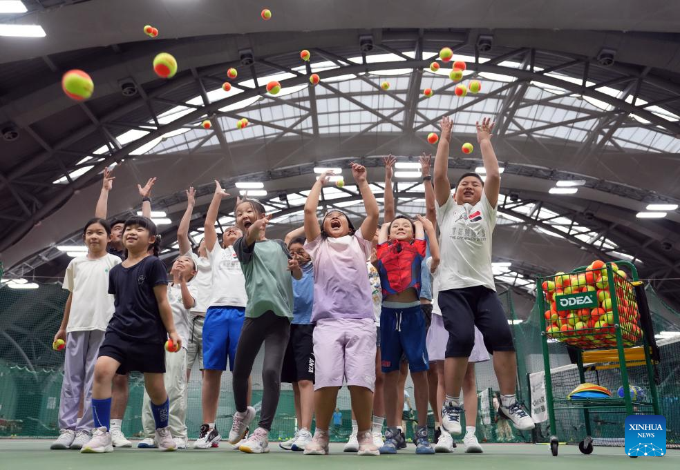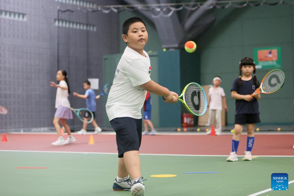 BEIJING, 15 agosto, 2024 (Xinhua) -- Imagen del 14 de agosto de 2024 de niños estudiantes participando en un campamento de verano de tenis en un club de tenis, en Beijing, capital de China. China ha experimentado recientemente un aumento en el entusiasmo por el tenis, como lo demuestra un notable incremento en la demanda de clases de entrenamiento y reservas de canchas en varias ciudades. Este aumento se puede atribuir a la histórica victoria de la tenista china Zheng Qinwen, quien consiguió la primera medalla de oro olímpica de tenis individual de China en los Juegos Olímpicos de París. Cabe mencionar que no solo cada vez más adultos han adoptado el tenis como actividad recreativa, sino que también un número cada vez mayor de padres han inscrito a sus hijos en cursos de entrenamiento de tenis, buscando transmitirles la alegría del deporte. Este creciente interés por el tenis ha llevado a un aumento correspondiente en el número de canchas de tenis y entrenadores disponibles. Estas tendencias demuestran claramente la creciente popularidad del tenis entre los entusiastas del deporte chino. (Xinhua/Cai Yang)