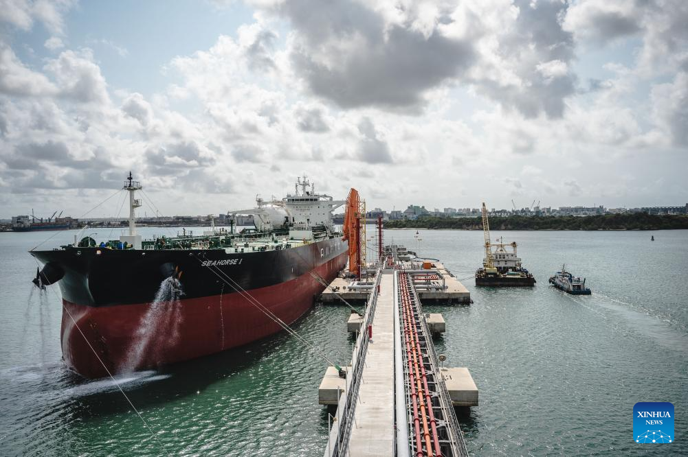 MOMBASA, 16 agosto, 2024 (Xinhua) -- Imagen del 15 de agosto de 2024 de trabajadores supervisando la transferencia de petróleo en la Terminal Petrolera Mombasa de Kenia, en Mombasa, Kenia. Construida por China Communications Construction Co., Ltd., la Terminal Petrolera Mombasa de Kenia comenzó operaciones oficialmente en agosto de 2022. La terminal ha mejorado en gran medida la capacidad de transferencia de petróleo y gas y la eficiencia de descarga de petróleo del puerto de Mombasa. (Xinhua/Wang Guansen)