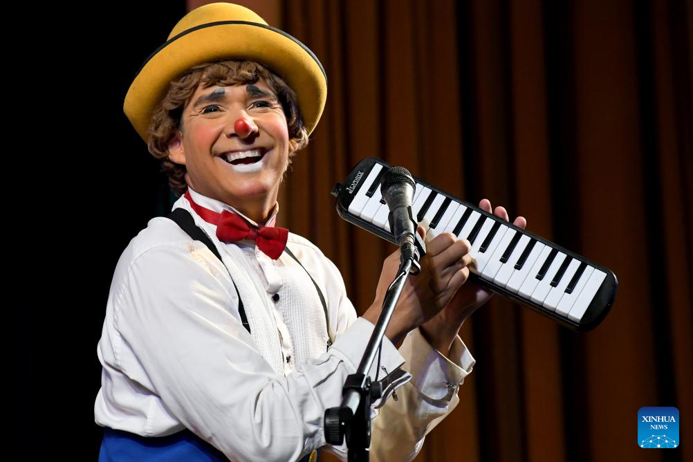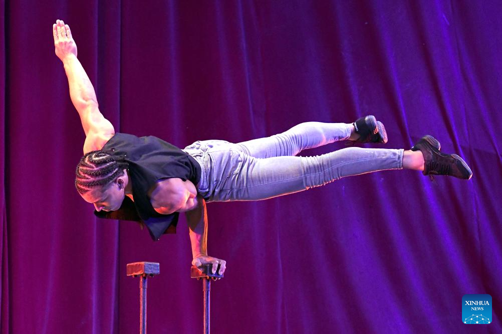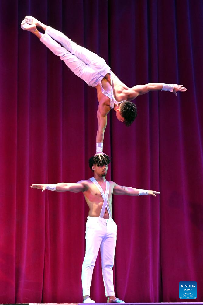LA HABANA, 16 agosto, 2024 (Xinhua) -- Imagen del 15 de agosto de 2024 de artistas cubanos realizando una presentación circense durante la inauguración de Circuba Internacional en la Sala Avellaneda del Teatro Nacional, en La Habana, capital de Cuba. El arte circense vuelve a atrapar a los cubanos por estos días con una nueva edición de Circuba Internacional, un evento anual que en esta ocasión, sin ser competitivo, reúne a artistas de México, Colombia, Chile y los anfitriones de Cuba. (Xinhua/Joaquín Hernández)