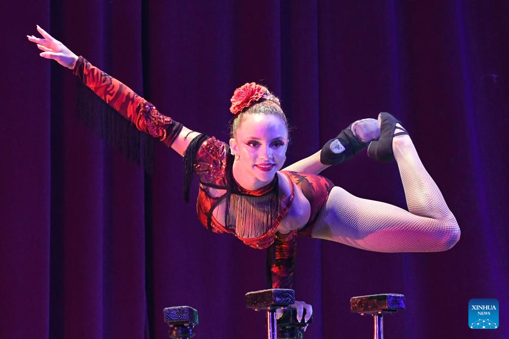 LA HABANA, 16 agosto, 2024 (Xinhua) -- Imagen del 15 de agosto de 2024 de una artista cubana realizando una presentación circense durante la inauguración de Circuba Internacional en la Sala Avellaneda del Teatro Nacional, en La Habana, capital de Cuba. El arte circense vuelve a atrapar a los cubanos por estos días con una nueva edición de Circuba Internacional, un evento anual que en esta ocasión, sin ser competitivo, reúne a artistas de México, Colombia, Chile y los anfitriones de Cuba. (Xinhua/Joaquín Hernández)