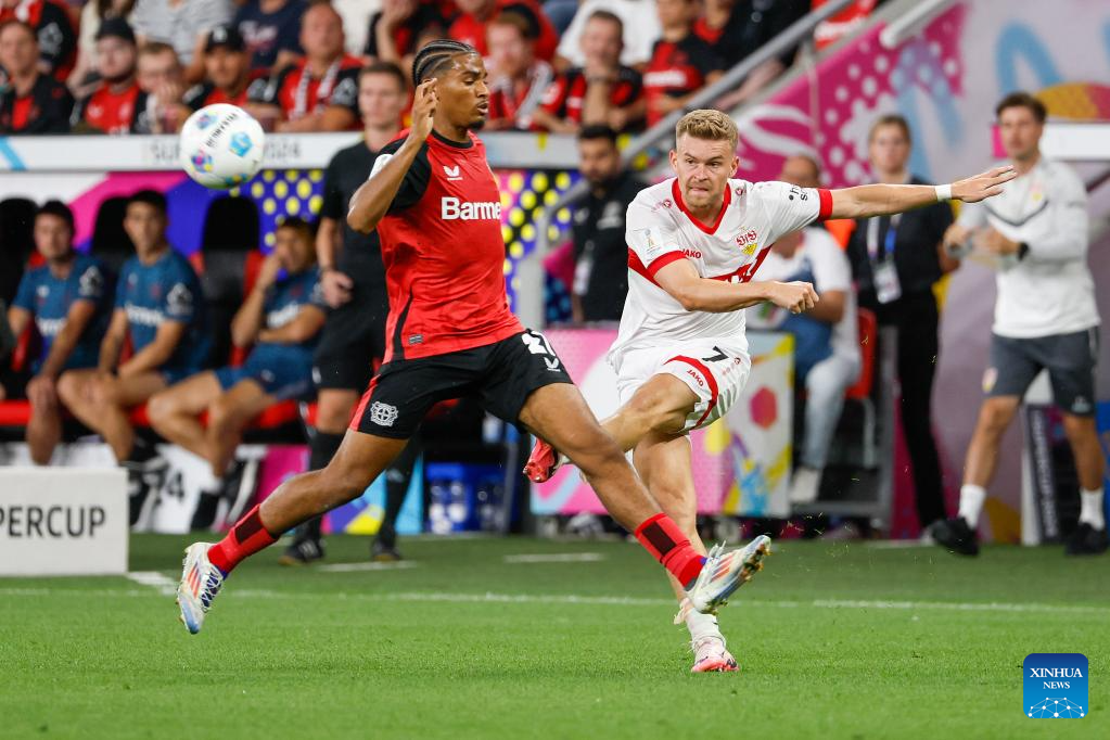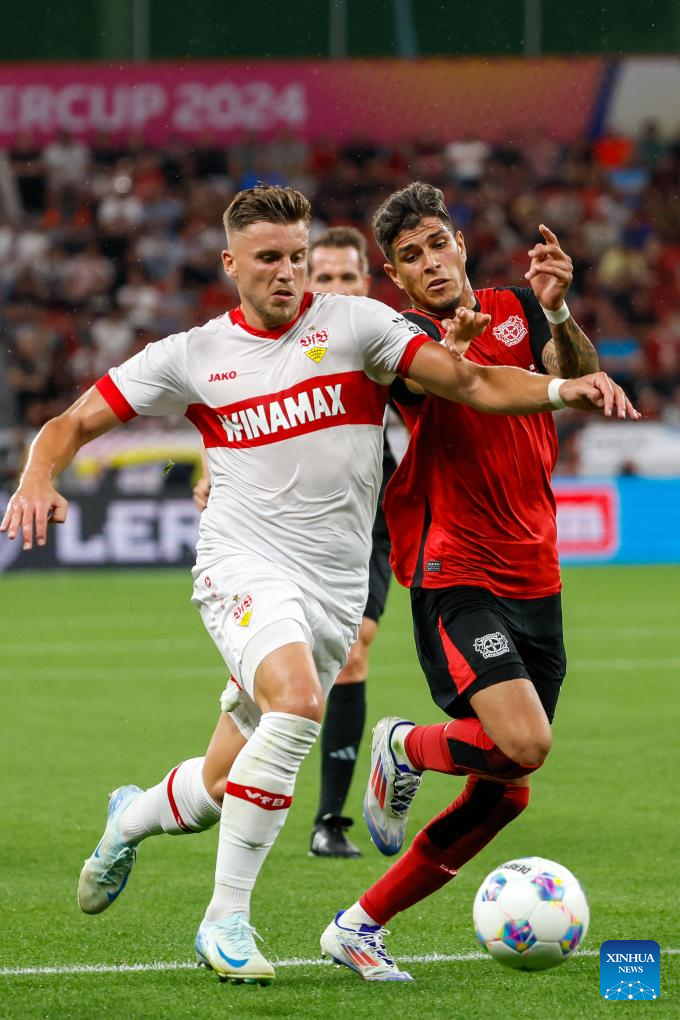 LEVERKUSEN, 18 agosto, 2024 (Xinhua) -- Imagen del 17 de agosto de 2024 de Amine Adli (i), de Bayer 04 Leverkusen, disputando el balón con Maximilian Mittelstaedt, de VfB Sttutgart, durante el partido correspondiente a la final de la Supercopa de Alemania entre Bayer 04 Leverkusen y VfB Stuttgart, en Leverkusen, Alemania. (Xinhua/Joachim Bywaletz)