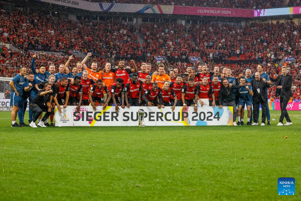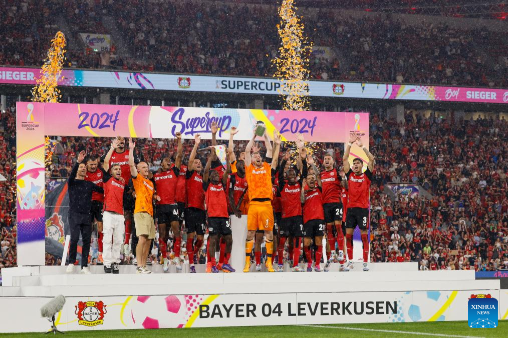 LEVERKUSEN, 18 agosto, 2024 (Xinhua) -- Imagen del 17 de agosto de 2024 de jugadores de Bayer 04 Leverkusen, festejando la victoria al término del partido correspondiente a la final de la Supercopa de Alemania entre Bayer 04 Leverkusen y VfB Stuttgart, en Leverkusen, Alemania. (Xinhua/Joachim Bywaletz)