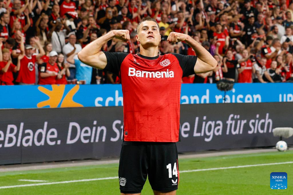 LEVERKUSEN, 18 agosto, 2024 (Xinhua) -- Imagen del 17 de agosto de 2024 de Patrik Schick, de Bayer 04 Leverkusen, festejando su anotación durante la final de la Supercopa de Alemania entre Bayer 04 Leverkusen y VfB Stuttgart, en Leverkusen, Alemania. (Xinhua/Joachim Bywaletz)