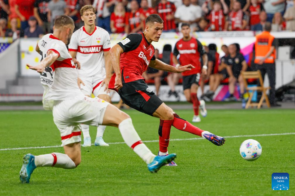 LEVERKUSEN, 18 agosto, 2024 (Xinhua) -- Imagen del 17 de agosto de 2024 de Patrik Schick (d), de Bayer 04 Leverkusen, disparando el balón para anotar durante el partido correspondiente a la final de la Supercopa de Alemania entre Bayer 04 Leverkusen y VfB Stuttgart, en Leverkusen, Alemania. (Xinhua/Joachim Bywaletz)