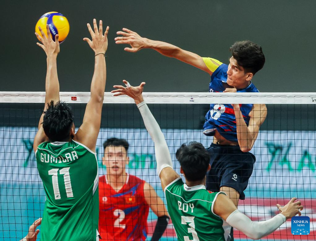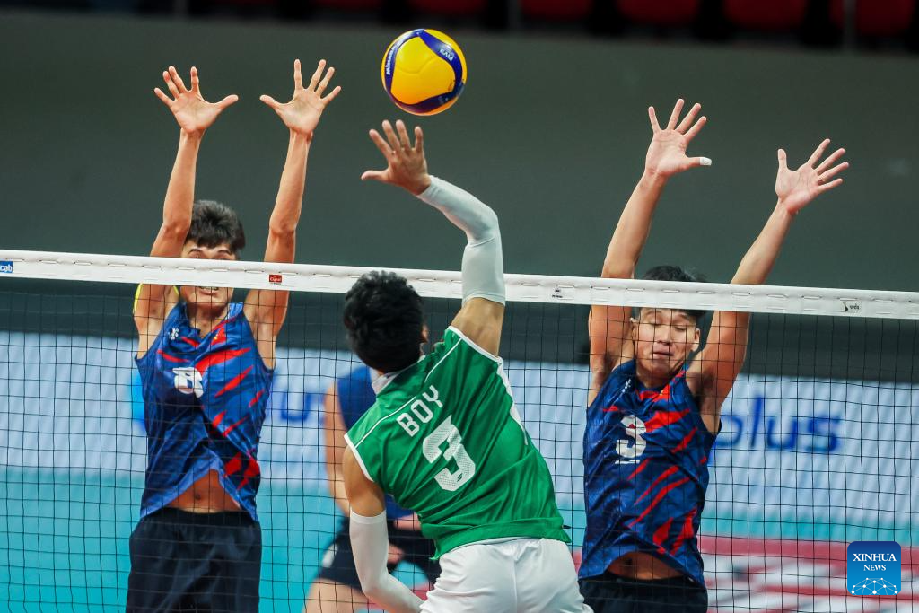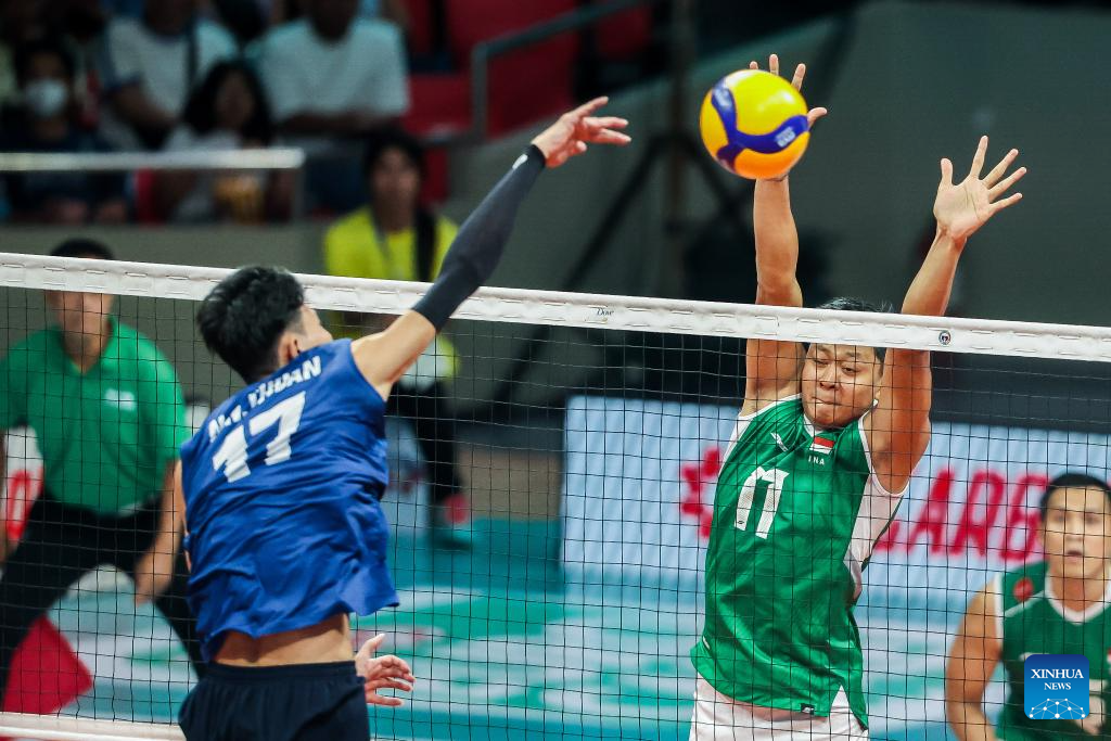 MANILA, 18 agosto, 2024 (Xinhua) -- Boy Arnez Arabi (c) de Indonesia clava el balón durante el partido entre Indonesia y Vietnam en la primera jornada de la Liga de Voleibol Masculino SEA, en Manila, Filipinas, el 18 de agosto de 2024. (Xinhua/Rouelle Umali)