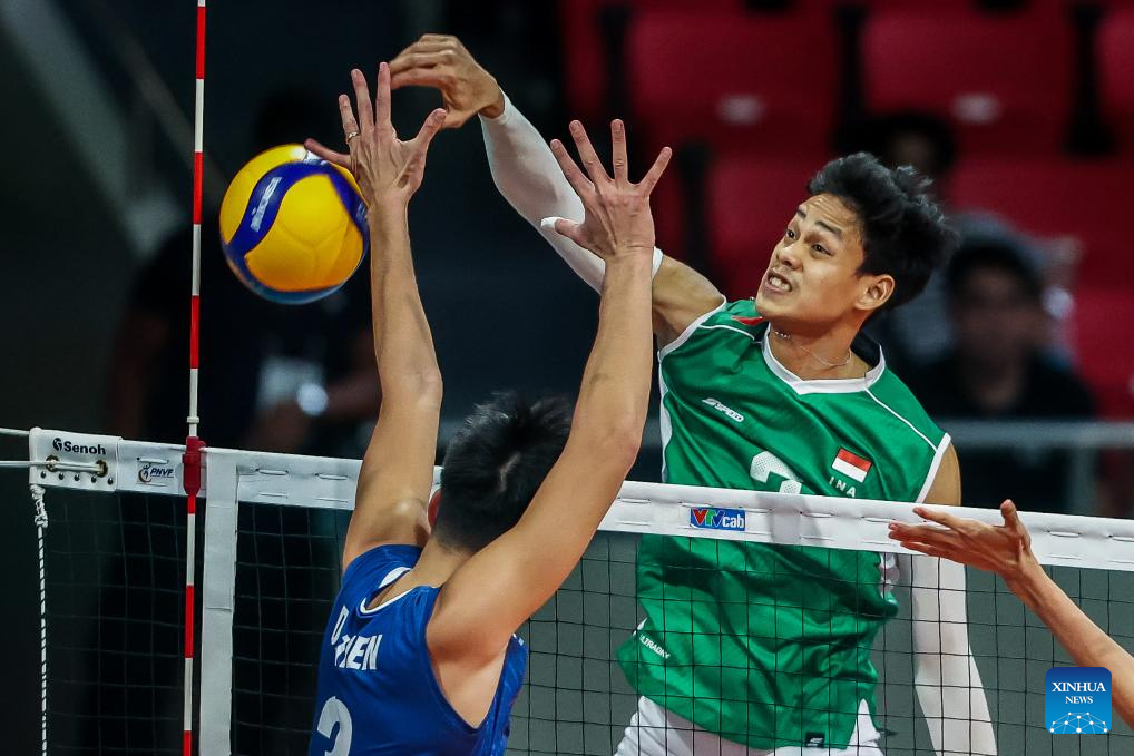 MANILA, 18 agosto, 2024 (Xinhua) -- Duy Tuyen Tran (d-arriba) de Vietnam clava el balón durante el partido entre Indonesia y Vietnam en la primera jornada de la Liga de Voleibol Masculino SEA, en Manila, Filipinas, el 18 de agosto de 2024. (Xinhua/Rouelle Umali)