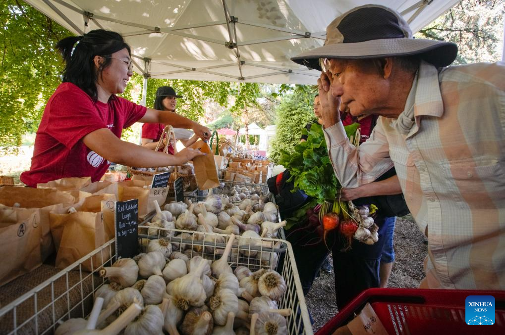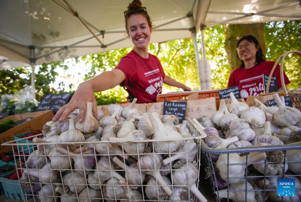 RICHMOND, 18 agosto, 2024 (Xinhua) -- Imagen del 17 de agosto de 2024 de personas comprando diferentes variedades de ajo durante el 14 Festival Anual del Ajo de Richmond, en Richmond, Columbia Británica, Canadá. (Xinhua/Liang Sen)