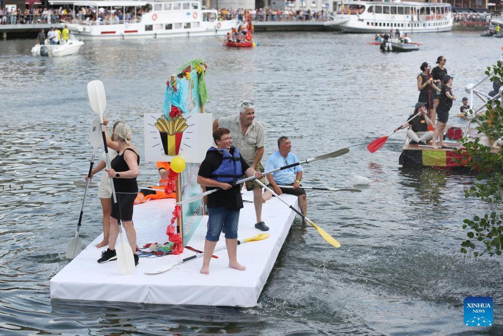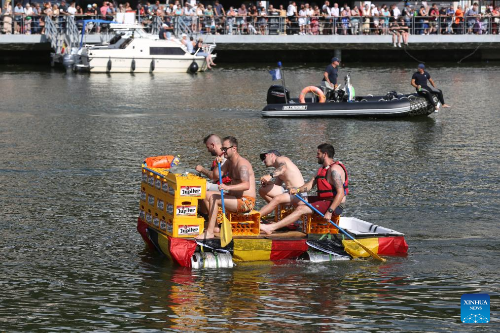 DINANT, 16 agosto, 2024 (Xinhua) -- Imagen del 15 de agosto de 2024 de personas participando en la Regata Internacional de Bañeras en el río Mosa, en Dinant, Bélgica. Desde 1982, participantes compiten por crear la más impresionante manualidad basada en una bañera y compiten por el río Mosa en Dinant el 15 de agosto de cada año. (Xinhua/Zhao Dingzhe)
