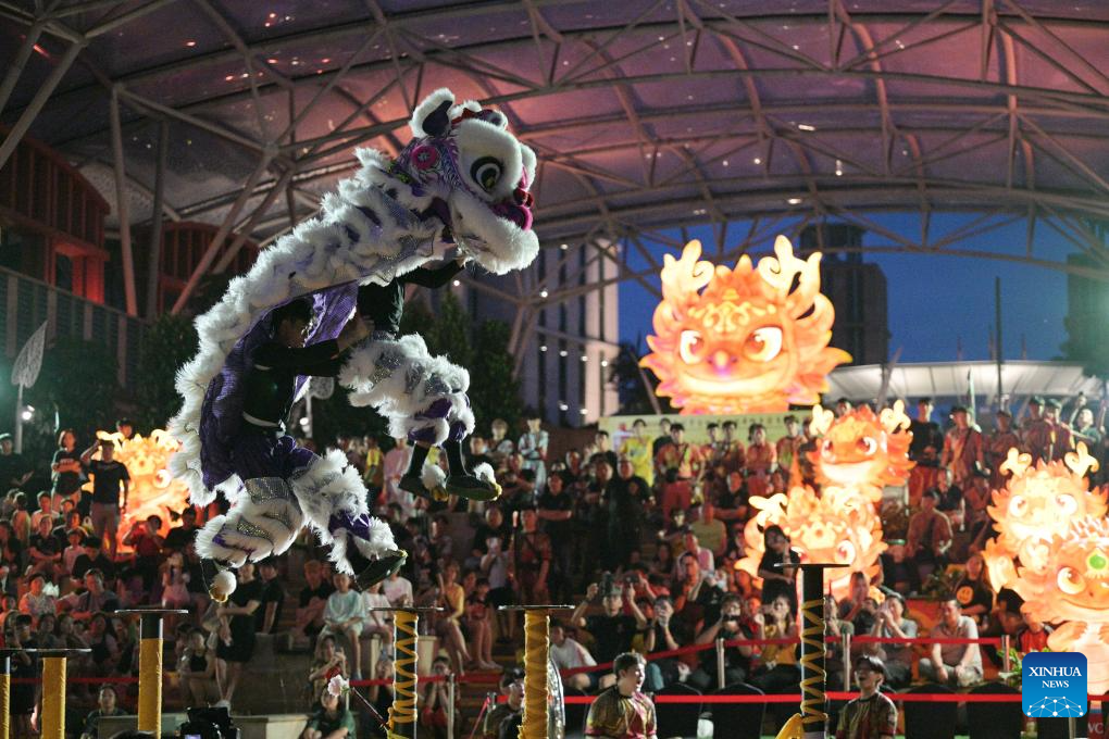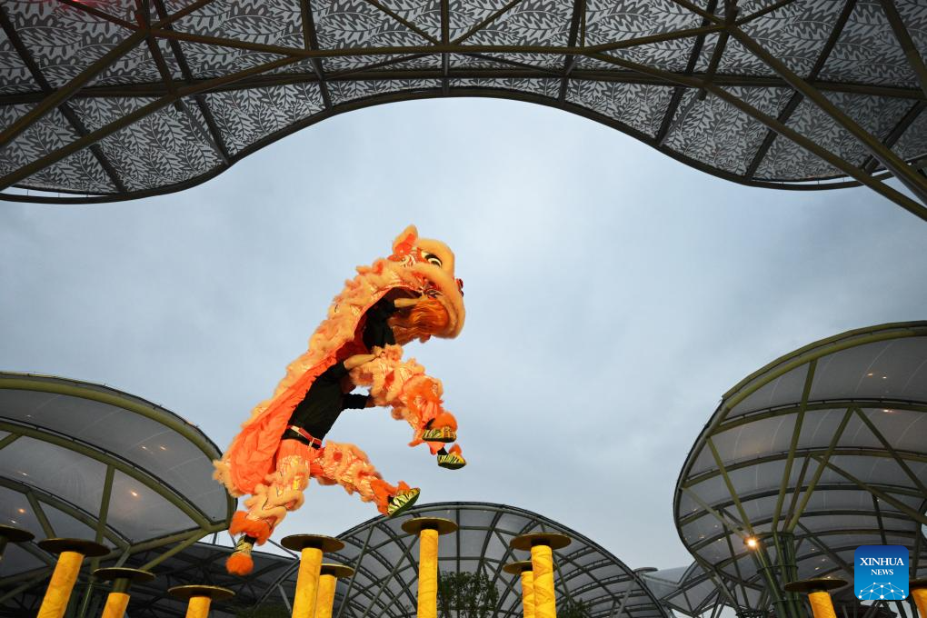 SINGAPUR, 17 agosto, 2024 (Xinhua) -- Concursantes compiten en una competencia de danza del león en el Resorts World Sentosa de Singapur, el 17 de agosto de 2024. (Xinhua/Then Chih Wey)