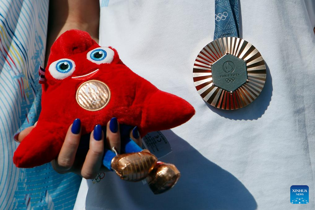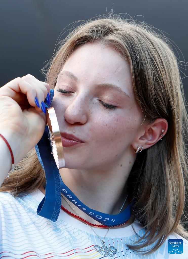 BUCAREST, 17 agosto, 2024 (Xinhua) -- Imagen del 16 de agosto de 2024 de la gimnasta rumana, Ana Barbosu, posando tras recibir una medalla de bronce olímpica en el ejercicio de suelo femenino de los Juegos Olímpicos de París 2024, durante una ceremonia, en Bucarest, Rumania. La medalla de bronce fue reasignada a Barbosu tras un fallo del Tribunal de Arbitraje Deportivo de la semana pasada que anuló una apelación presentada por la entrenadora del equipo de Estados Unidos, Cecile Landi, durante la final del ejercicio de suelo del 5 de agosto en París, que había catapultado a Chiles al tercer lugar y relegado a Barbosu al cuarto. (Xinhua/Cristian Cristel)