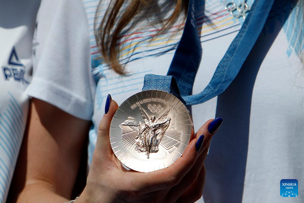 BUCAREST, 17 agosto, 2024 (Xinhua) -- Imagen del 16 de agosto de 2024 de la gimnasta rumana, Ana Barbosu (d), asistiendo a una ceremonia para recibir una medalla de bronce olímpica en el ejercicio de suelo femenino de los Juegos Olímpicos de París 2024, en Bucarest, Rumania. La medalla de bronce fue reasignada a Barbosu tras un fallo del Tribunal de Arbitraje Deportivo de la semana pasada que anuló una apelación presentada por la entrenadora del equipo de Estados Unidos, Cecile Landi, durante la final del ejercicio de suelo del 5 de agosto en París, que había catapultado a Chiles al tercer lugar y relegado a Barbosu al cuarto. (Xinhua/Cristian Cristel)
