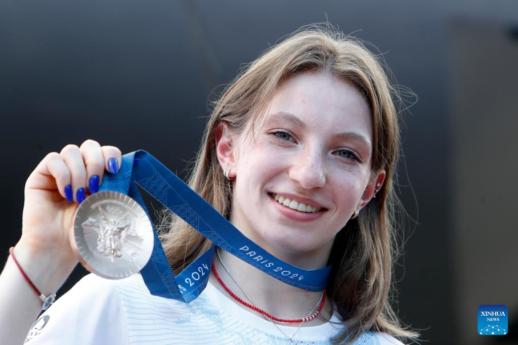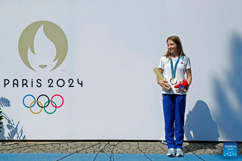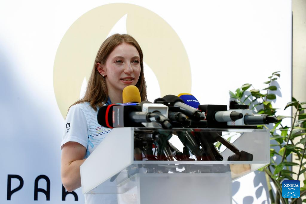 BUCAREST, 17 agosto, 2024 (Xinhua) -- Imagen del 16 de agosto de 2024 de la gimnasta rumana, Ana Barbosu, dirigiéndose a los representantes de los medios de comunicación tras recibir una medalla de bronce olímpica en el ejercicio de suelo femenino de los Juegos Olímpicos de París 2024, durante una ceremonia, en Bucarest, Rumania. La medalla de bronce fue reasignada a Barbosu tras un fallo del Tribunal de Arbitraje Deportivo de la semana pasada que anuló una apelación presentada por la entrenadora del equipo de Estados Unidos, Cecile Landi, durante la final del ejercicio de suelo del 5 de agosto en París, que había catapultado a Chiles al tercer lugar y relegado a Barbosu al cuarto. (Xinhua/Cristian Cristel)