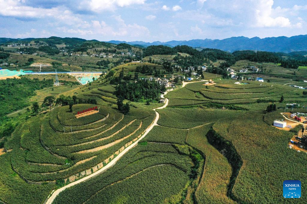 HUAIREN, 16 agosto, 2024 (Xinhua) -- Vista aérea tomada con un dron el 15 de agosto de 2024 de un campo de sorgo, en la aldea de Maopo del poblado de Changgang, en la ciudad de Huairen de la provincia de Guizhou, en el suroeste de China. Con una superficie de 24.000 hectáreas, los campos de sorgo de Huairen han entrado sucesivamente en su temporada de cosecha recientemente. (Xinhua/Yang Wenbin)