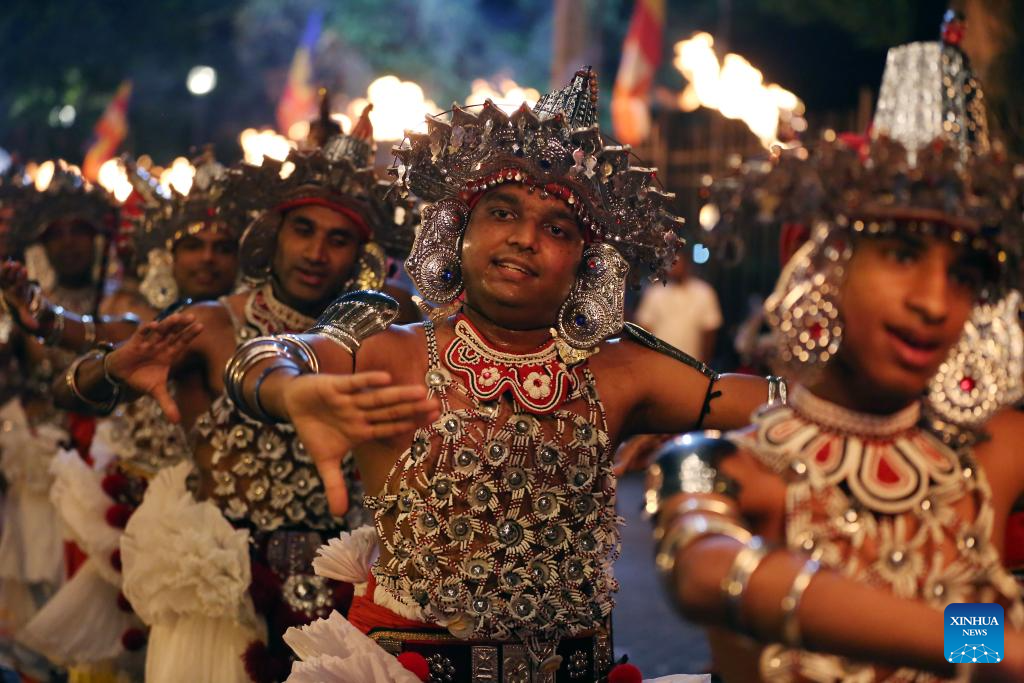 KANDY, 20 agosto, 2024 (Xinhua) -- Imagen del 19 de agosto de 2024 de bailarines realizando una presentación durante una procesión para celebrar el festival Esala Perahera, en Kandy, Sri Lanka. Esala Perahera es uno de los festivales budistas más grandes de Sri Lanka, con una historia de más de 1.000 años. El festival de este año se celebró del 10 al 20 de agosto. (Xinhua/Ajith Perera)