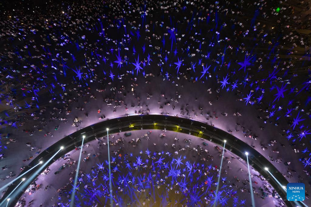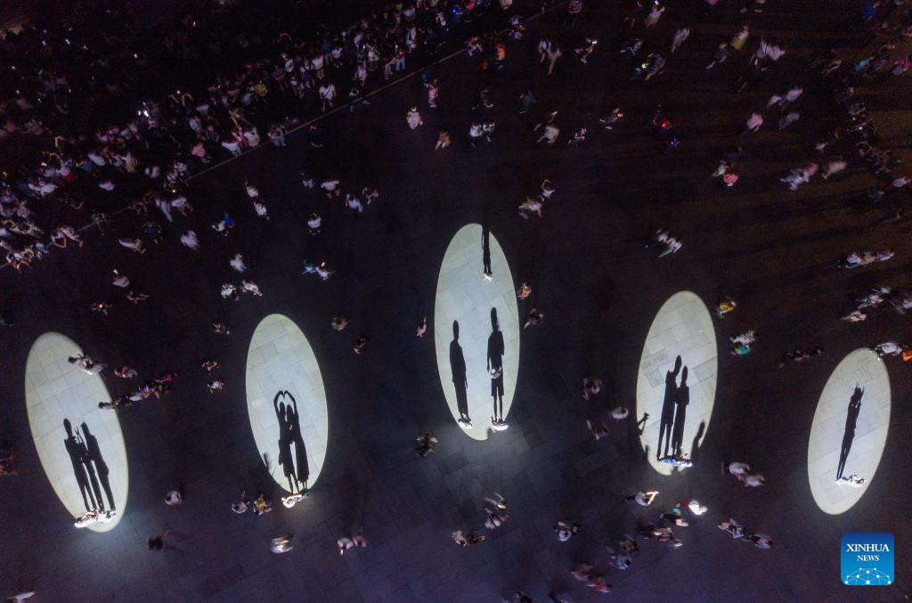 HARBIN, 20 agosto, 2024 (Xinhua) -- Vista aérea tomada con un dron el 14 de agosto de 2024 de personas experimentando un espectáculo de luces, en Harbin, en la provincia de Heilongjiang, en el noreste de China. Conocida como la "Ciudad de Hielo" de China, Harbin tiene fama de tener un clima fresco y atracciones diversificadas, incluso durante los meses de verano, lo que la ayuda a seguir siendo atractiva para los turistas durante todo el año. (Xinhua/Wang Jianwei)