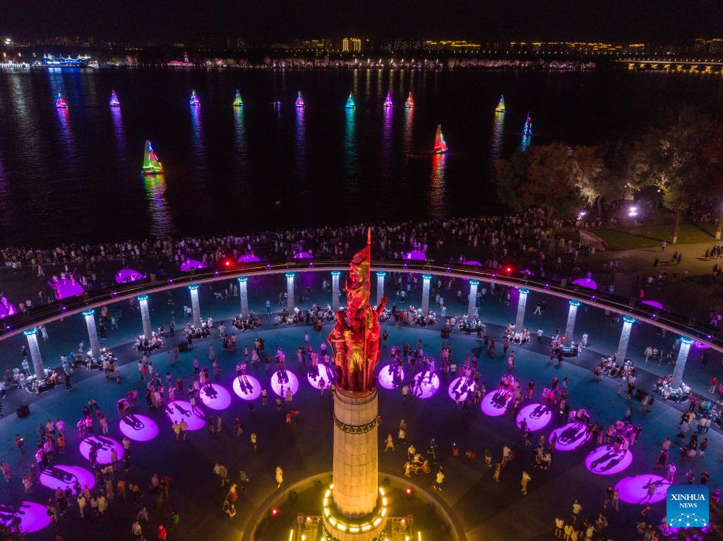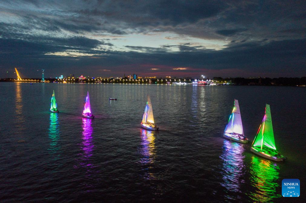 HARBIN, 20 agosto, 2024 (Xinhua) -- Vista aérea tomada con un dron el 14 de agosto de 2024 de un espectáculo de luces con veleros en la sección Harbin del río Songhua, en Harbin, en la provincia de Heilongjiang, en el noreste de China. Conocida como la "Ciudad de Hielo" de China, Harbin tiene fama de tener un clima fresco y atracciones diversificadas, incluso durante los meses de verano, lo que la ayuda a seguir siendo atractiva para los turistas durante todo el año. (Xinhua/Wang Jianwei)
