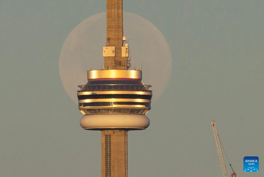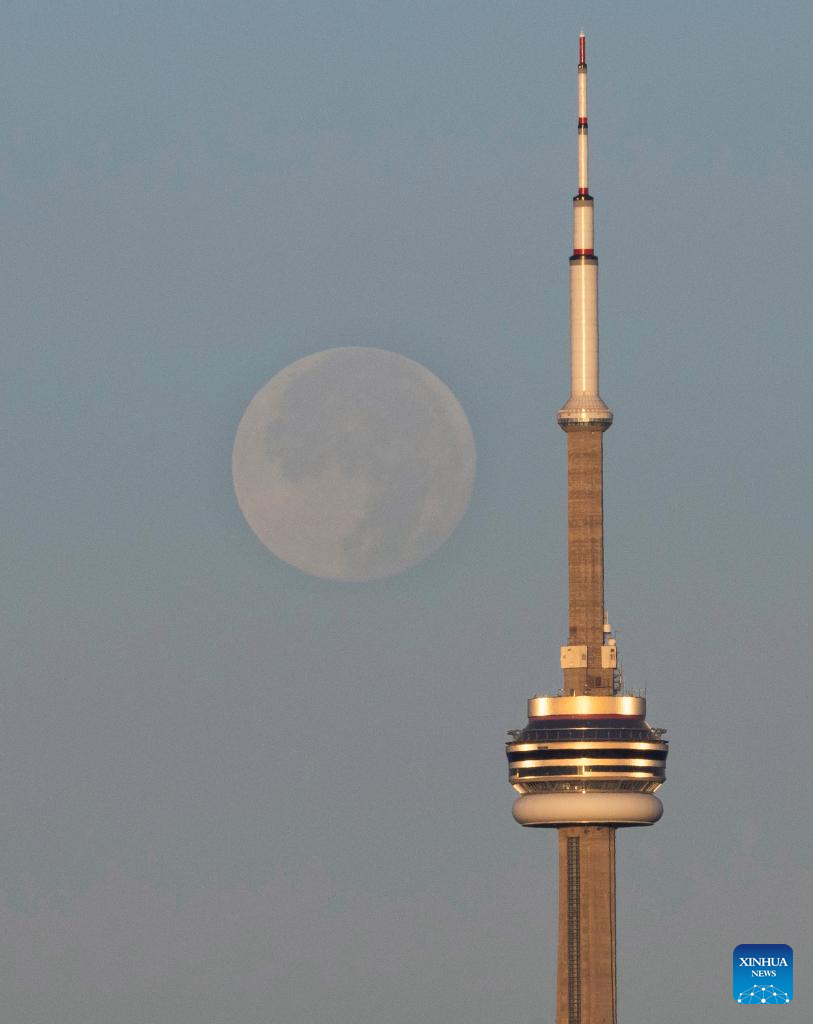 TORONTO, 20 agosto, 2024 (Xinhua) -- La luna llena es vista con la Torre Nacional Canadiense al amanecer, en Toronto, Canadá, el 20 de agosto de 2024. (Xinhua/Zou Zheng)