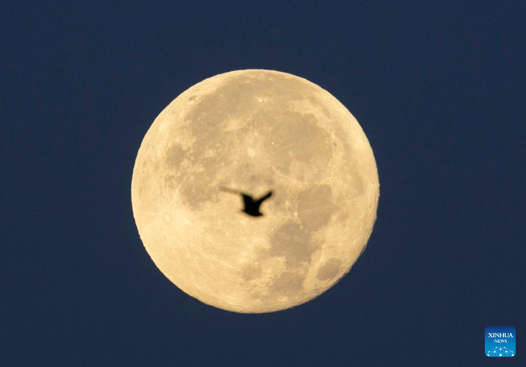 TORONTO, 20 agosto, 2024 (Xinhua) -- Un ave vuela frente a la luna llena, en Toronto, Canadá, el 20 de agosto de 2024. (Xinhua/Zou Zheng)