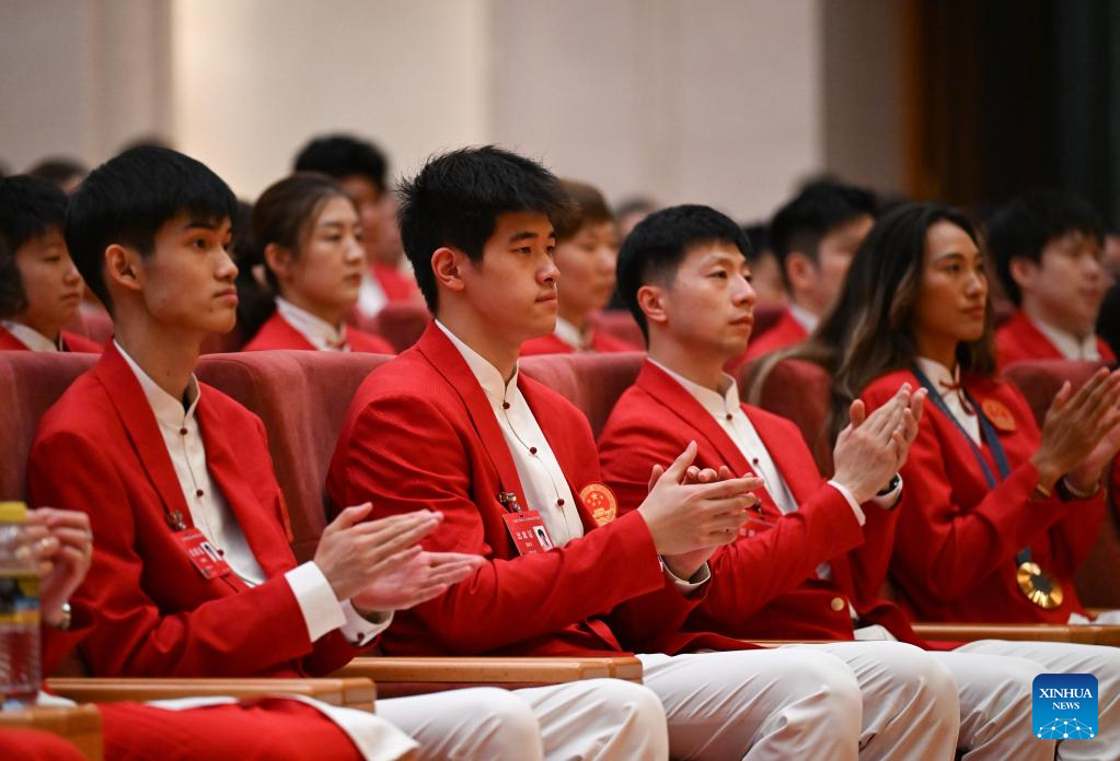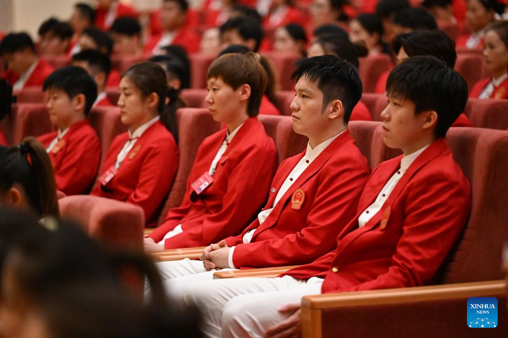 BEIJING, 20 agosto, 2024 (Xinhua) -- Los jugadores de tenis de mesa Fan Zhendong (2-d) y Wang Chuqin (d) asisten a la ceremonia de evaluación de la delegación olímpica china en París 2024, en Beijing, capital de China, el 20 de agosto de 2024. (Xinhua/Song Yanhua)