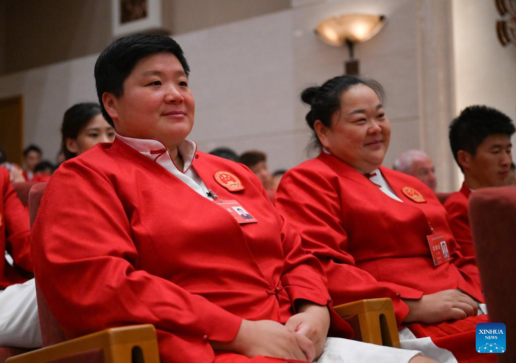 BEIJING, 20 agosto, 2024 (Xinhua) -- La lanzadora de peso Gong Lijiao (i) y la lanzadora de martillo Wang Zheng asisten a la ceremonia de evaluación de la delegación olímpica china en París 2024, en Beijing, capital de China, el 20 de agosto de 2024. (Xinhua/Song Yanhua)