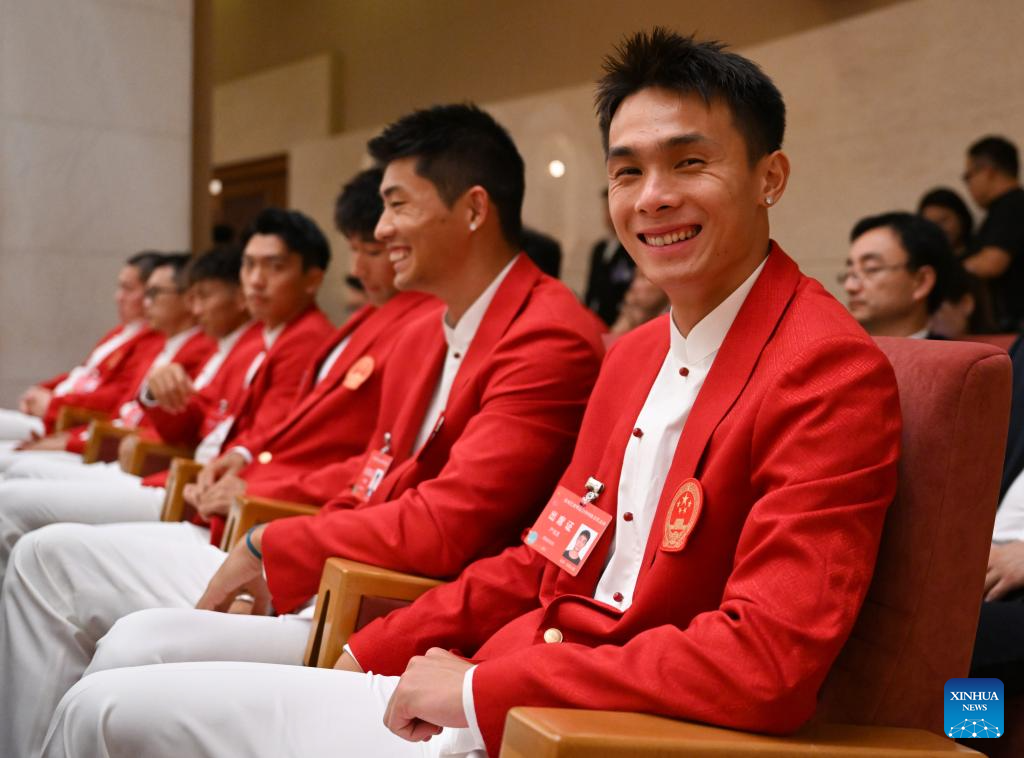 BEIJING, 20 agosto, 2024 (Xinhua) -- El velocista Yan Haibin (d-frente) asiste a la ceremonia de evaluación de la delegación olímpica china en París 2024, en Beijing, capital de China, el 20 de agosto de 2024. (Xinhua/Song Yanhua)