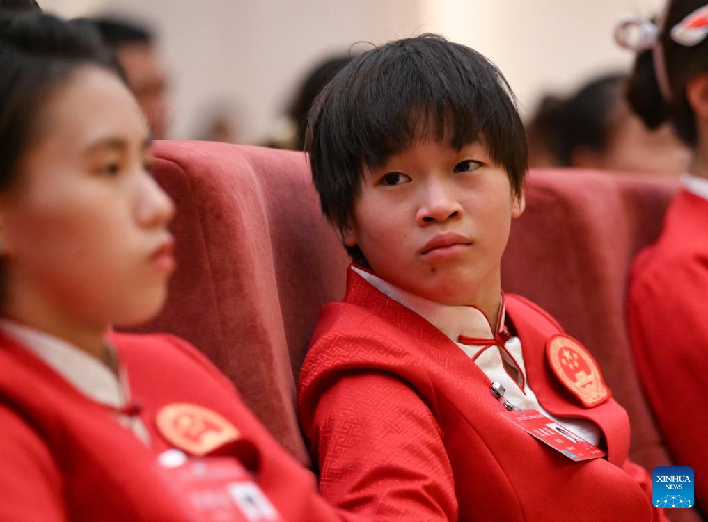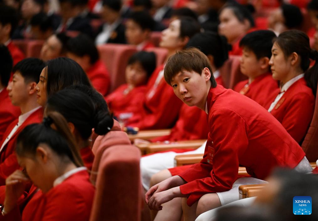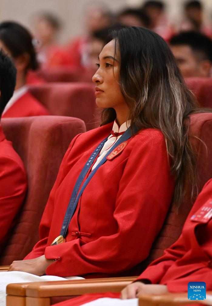 BEIJING, 20 agosto, 2024 (Xinhua) -- La clavadista Quan Hongchan asiste a la ceremonia de evaluación de la delegación olímpica china en París 2024, en Beijing, capital de China, el 20 de agosto de 2024. (Xinhua/Song Yanhua)