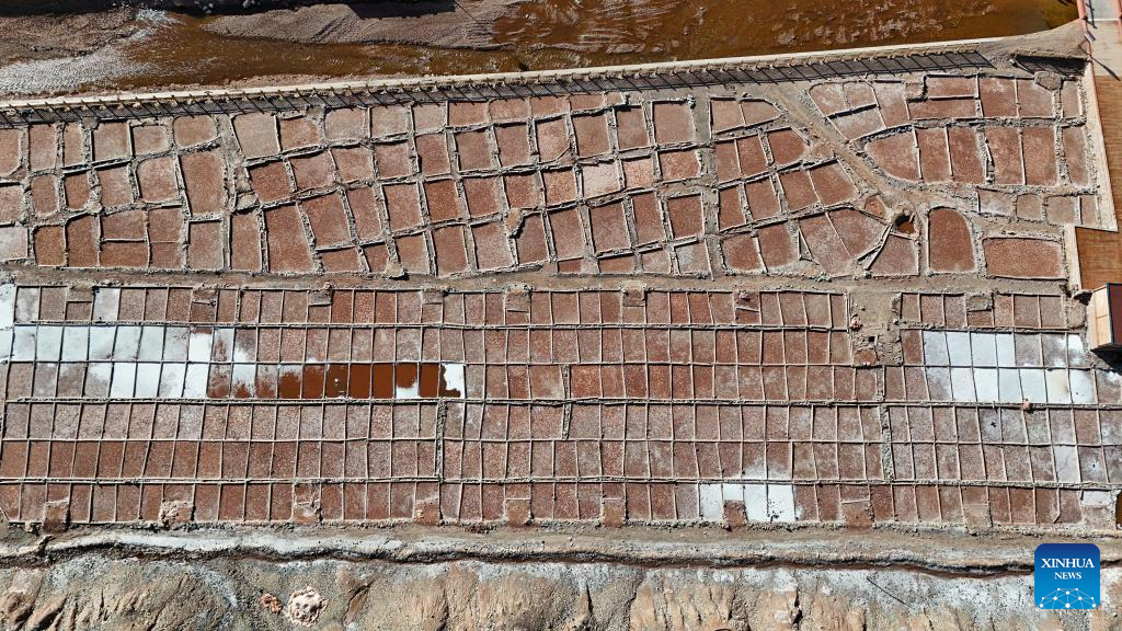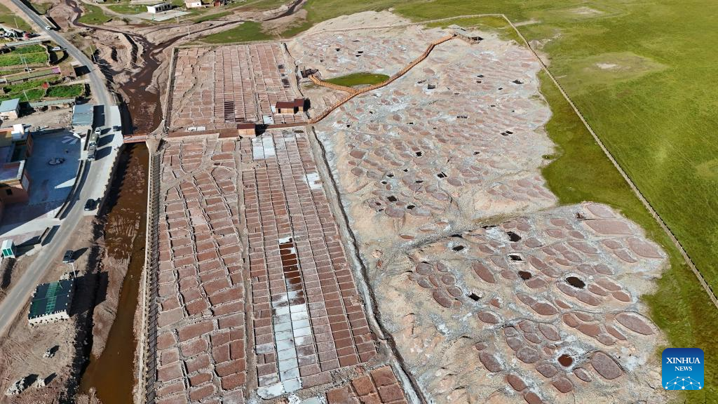 YUSHU, 20 agosto, 2024 (Xinhua) -- Vista aérea tomada con un dron del 20 de agosto de 2024 del campo de sal de Baizha, en el municipio de Baizha del distrito de Nangqian, en la prefectura autónoma tibetana de Yushu, en la provincia de Qinghai, en el noroeste de China. Situado a una altitud de más de 4.000 metros, el campo de sal tiene una historia de producción de sal de más de mil años. (Xinhua/Tang Rufeng)