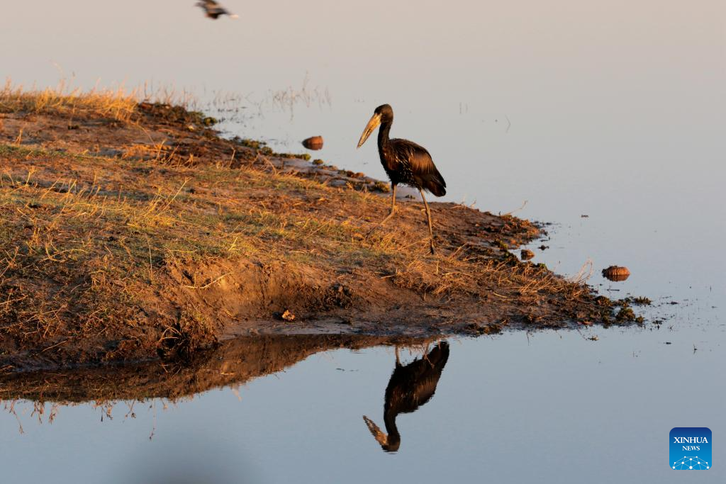 KASANE, 19 agosto, 2024 (Xinhua) -- Imagen del 11 de agosto de 2024 de una cigüeña de pico amarillo vista en el Parque Nacional de Chobe, en el norte de Botsuana. (Xinhua/Metlha Ngubevana)