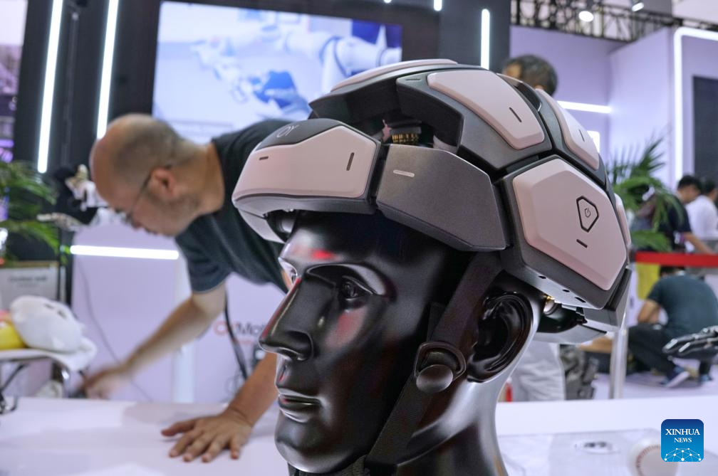 BEIJING, 21 agosto, 2024 (Xinhua) -- Un dispositivo de electroencefalograma inteligente es visto durante la Conferencia Mundial de Robots 2024, en Beijing, capital de China, el 21 de agosto de 2024. La Conferencia Mundial de Robots 2024 se inauguró aquí el miércoles. (Xinhua/Li Xin)