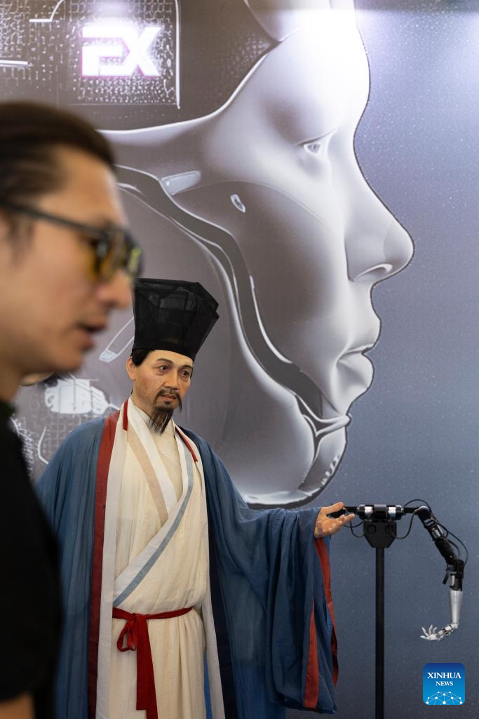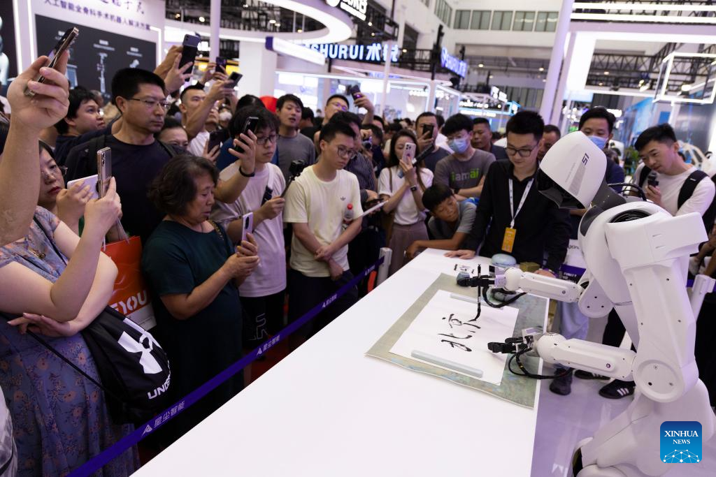 BEIJING, 21 agosto, 2024 (Xinhua) -- Visitantes observan como un robot escribe caligrafía china durante la Conferencia Mundial de Robots 2024, en Beijing, capital de China, el 21 de agosto de 2024. La Conferencia Mundial de Robots 2024 se inauguró aquí el miércoles. (Xinhua/Jin Liwang)