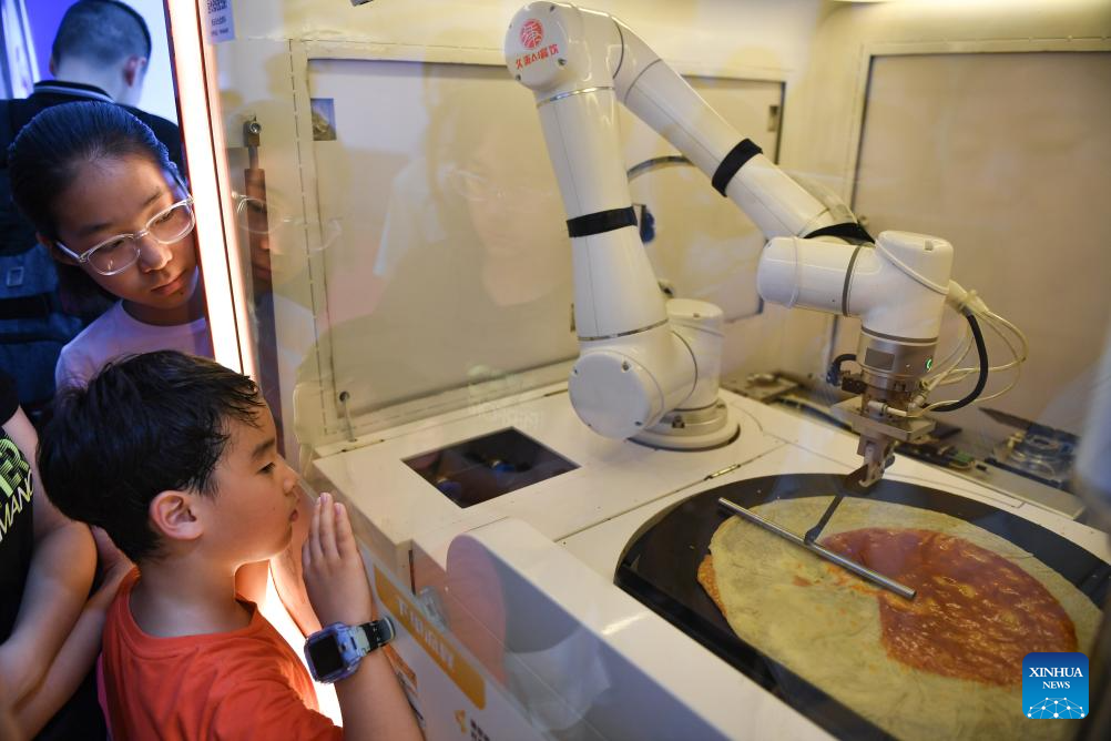 BEIJING, 21 agosto, 2024 (Xinhua) -- Visitantes observan como un robot prepara Jian Bing, el crepe chino, durante la Conferencia Mundial de Robots 2024, en Beijing, capital de China, el 21 de agosto de 2024. La Conferencia Mundial de Robots 2024 se inauguró aquí el miércoles. (Xinhua/Chen Zhonghao)
