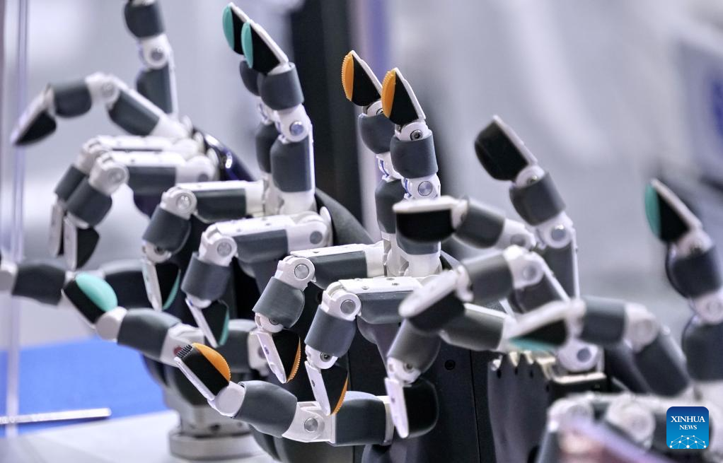 BEIJING, 21 agosto, 2024 (Xinhua) -- Manos robóticas inteligentes son vistas durante la Conferencia Mundial de Robots 2024, en Beijing, capital de China, el 21 de agosto de 2024. La Conferencia Mundial de Robots 2024 se inauguró aquí el miércoles. (Xinhua/Li Xin)