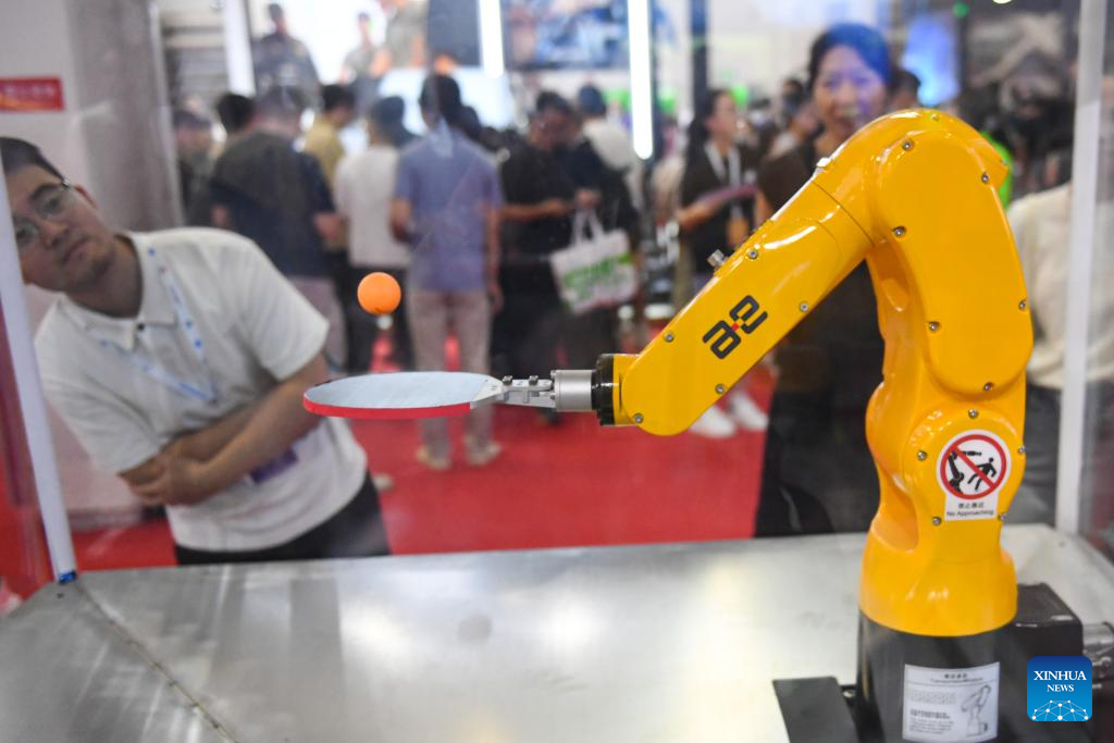BEIJING, 21 agosto, 2024 (Xinhua) -- Visitantes observan como un robot juega ping-pong durante la Conferencia Mundial de Robots 2024, en Beijing, capital de China, el 21 de agosto de 2024. La Conferencia Mundial de Robots 2024 se inauguró aquí el miércoles. (Xinhua/Chen Zhonghao)