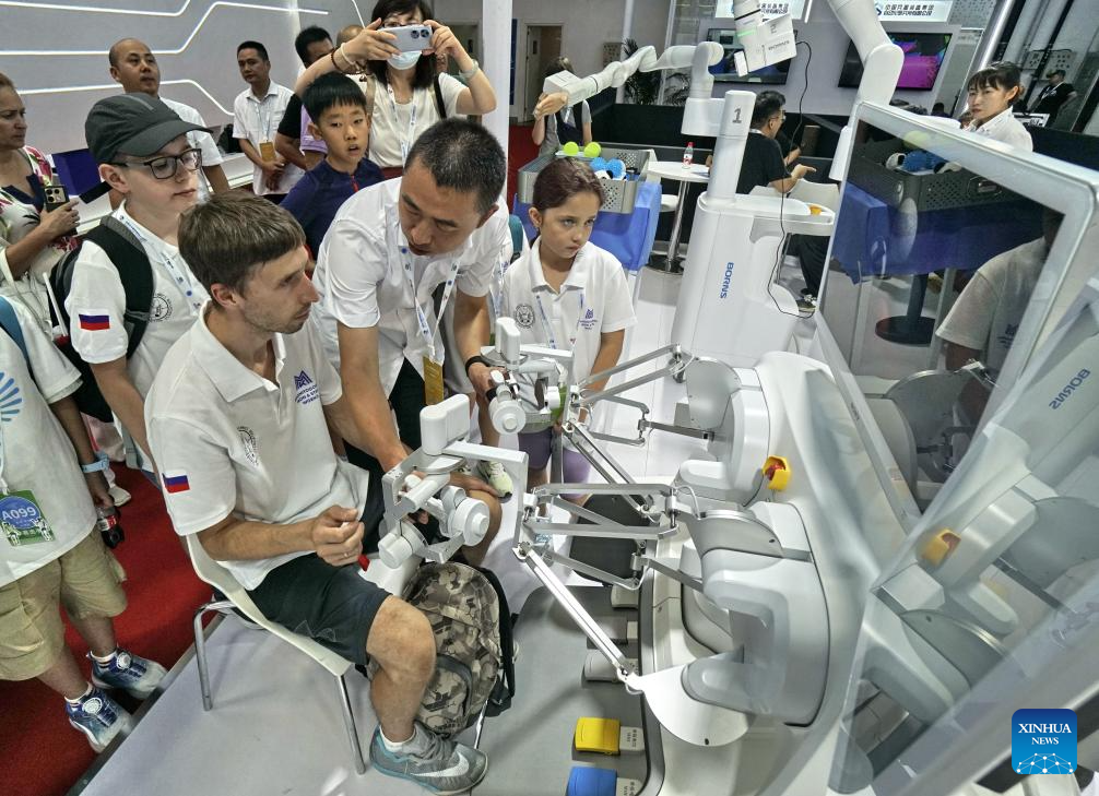 BEIJING, 21 agosto, 2024 (Xinhua) -- Un visitante interactúa con un robot médico durante la Conferencia Mundial de Robots 2024, en Beijing, capital de China, el 21 de agosto de 2024. La Conferencia Mundial de Robots 2024 se inauguró aquí el miércoles. (Xinhua/Li Xin)