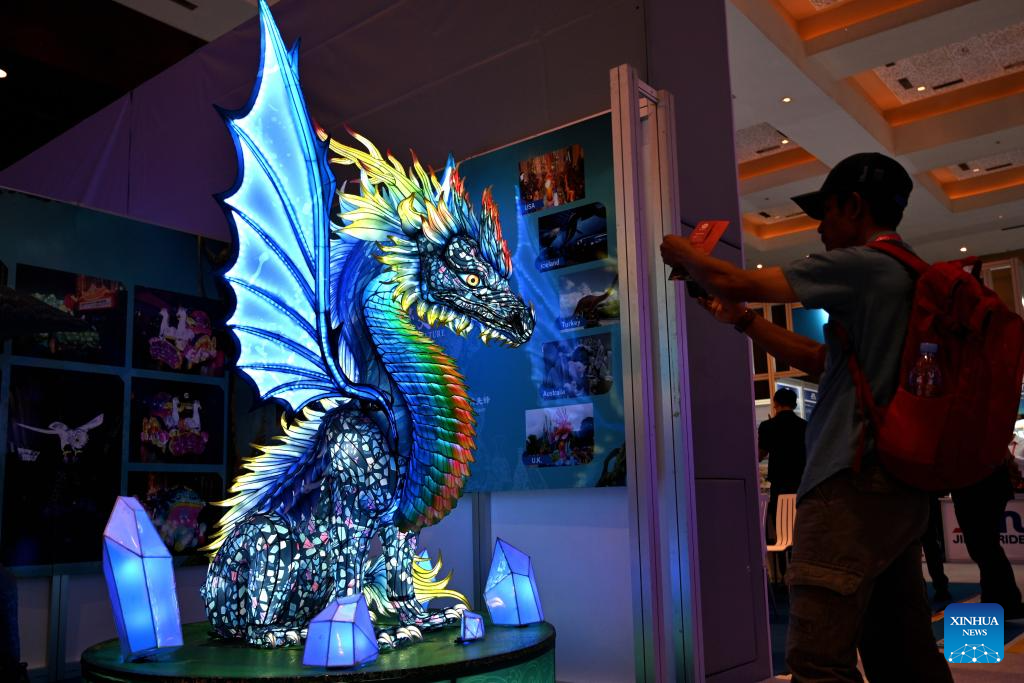 YAKARTA, 21 agosto, 2024 (Xinhua) -- Un visitante toma fotografías a una instalación con forma de dragón en la Fun Asia Expo 2024, en Yakarta, Indonesia, el 21 de agosto de 2024. La exposición de dos días que incluye atracciones de parques de diversiones y juegos de ocio comenzó aquí el miércoles. (Xinhua/Veri Sanovri)