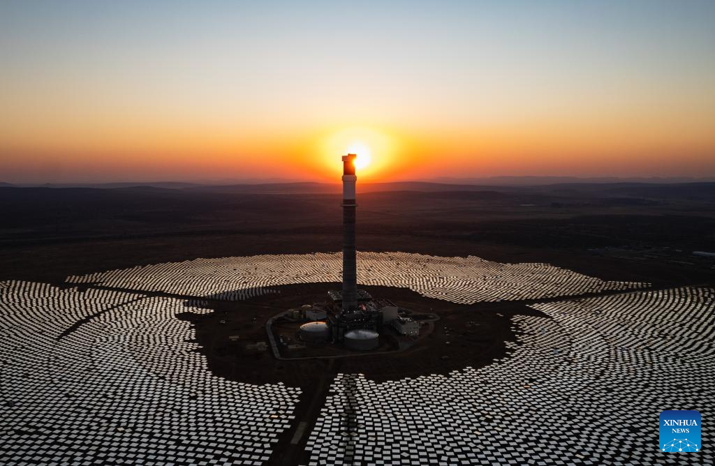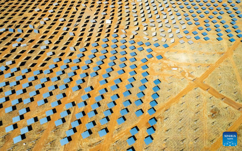 POSTMASBURG, 21 agosto, 2024 (Xinhua) -- Vista aérea tomada con un dron el 20 de agosto de 2024 de conjuntos de reflectores del Proyecto de Energía Térmica Solar Concentrada de Redstone cerca de Postmasburg, en la provincia de Cabo Norte, Sudáfrica. El proyecto es una de las plantas de energía renovable más grandes del país. (Xinhua/Zhang Yudong)