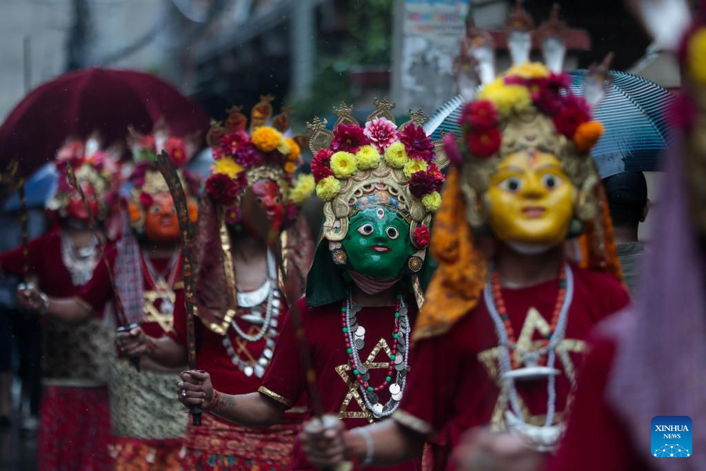 KATMANDU, 21 agosto, 2024 (Xinhua) -- Bailarines enmascarados participan en un desfile durante el festival Khadga Jatra, en Katmandú, Nepal, el 21 de agosto de 2024. (Xinhua/Sulav Shrestha)