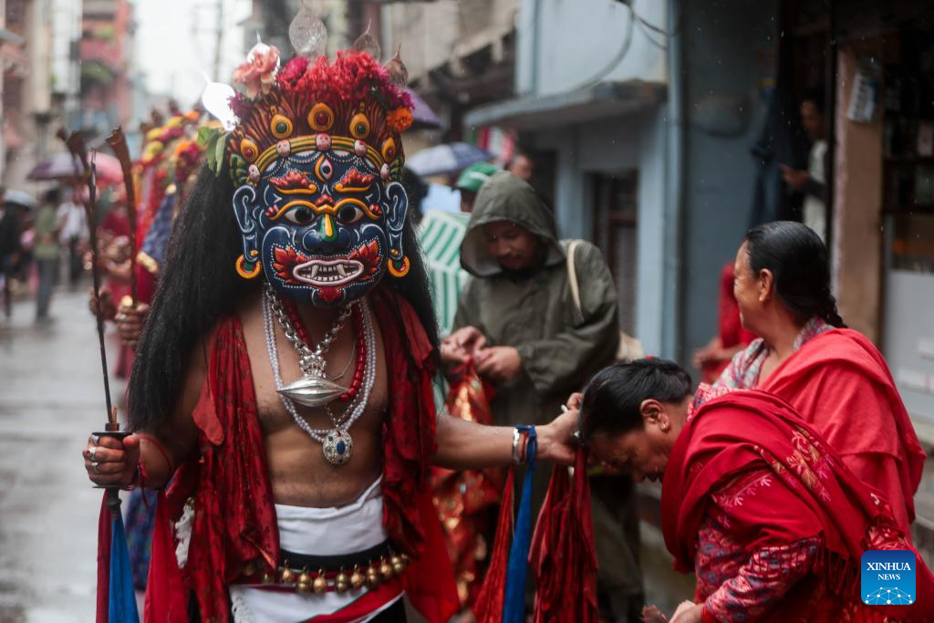 KATMANDU, 21 agosto, 2024 (Xinhua) -- Un bailarín enmascarado participa en un desfile durante el festival Khadga Jatra, en Katmandú, Nepal, el 21 de agosto de 2024. (Xinhua/Sulav Shrestha)