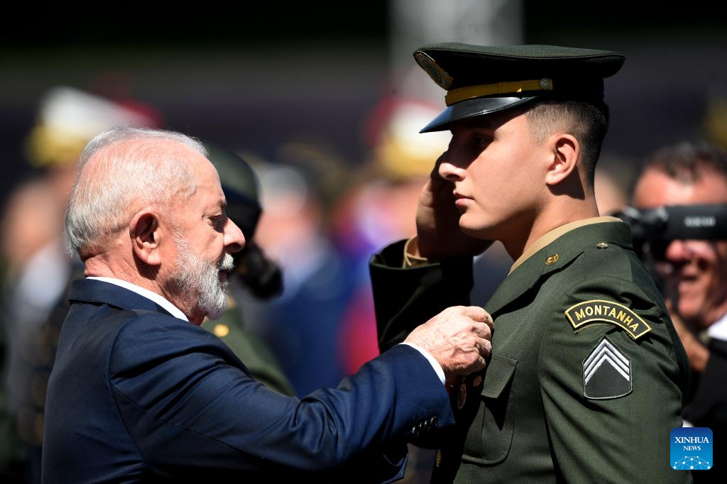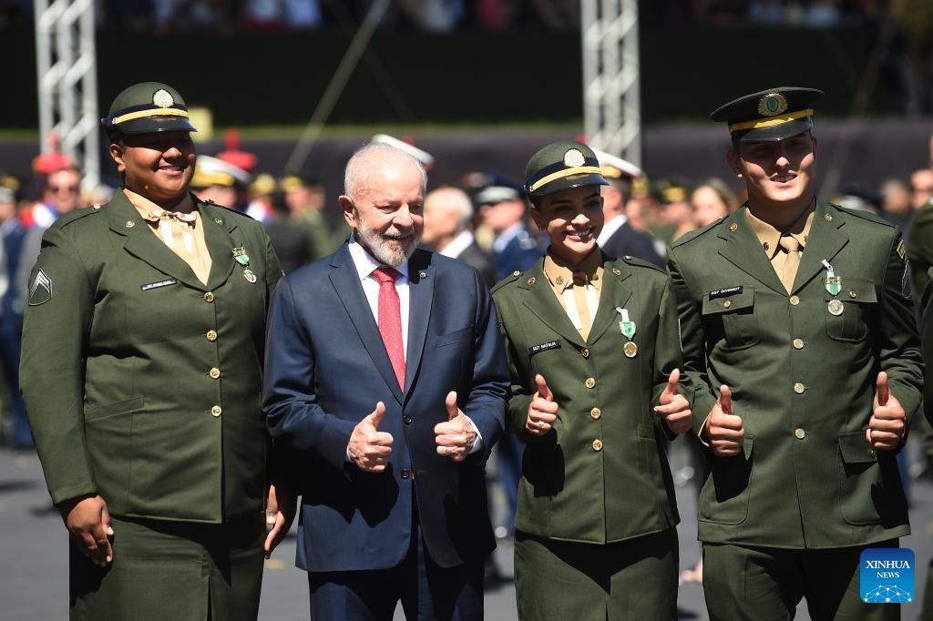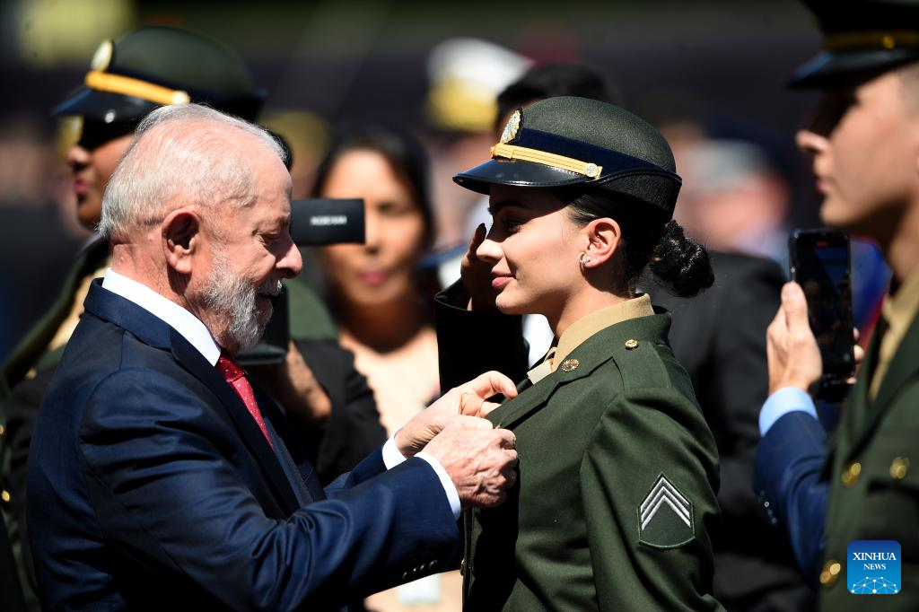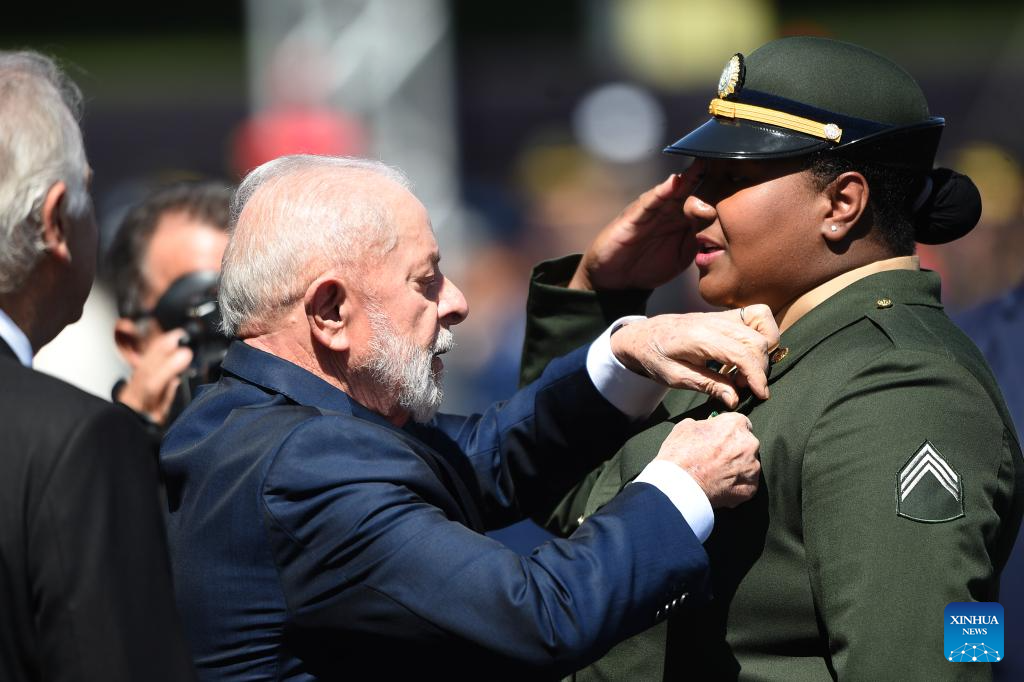 BRASILIA, 22 agosto, 2024 (Xinhua) -- El presidente brasileño, Luiz Inácio Lula da Silva (i), condecora a la medallista de bronce en voleibol en los Juegos Olímpicos de París 2024, Natália Araújo (d), durante el desfile militar en conmemoración del Día del Soldado, en Brasilia, Brasil, el 22 de agosto de 2024. (Xinhua/Lucio Tavora)