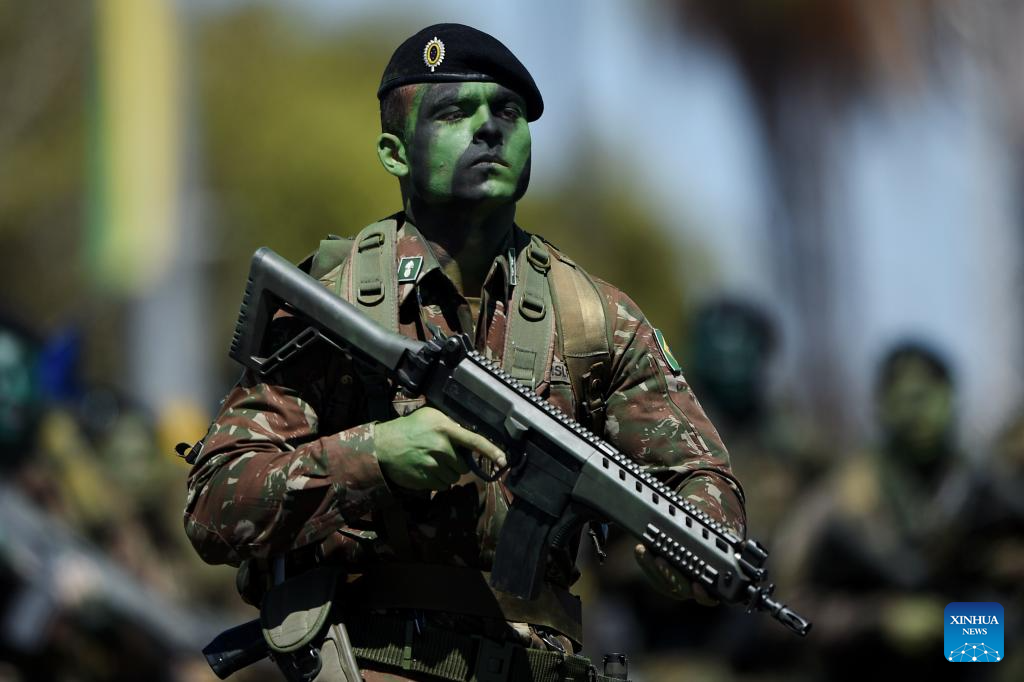 BRASILIA, 22 agosto, 2024 (Xinhua) -- Un soldado del Ejército brasileño marcha durante el desfile militar en conmemoración del Día del Soldado, en Brasilia, Brasil, el 22 de agosto de 2024. (Xinhua/Lucio Tavora)