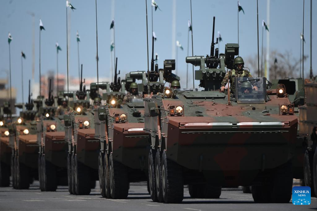 BRASILIA, 22 agosto, 2024 (Xinhua) -- Soldados del Ejército brasileño viajan a bordo de vehículos blindados durante el desfile militar en conmemoración del Día del Soldado, en Brasilia, Brasil, el 22 de agosto de 2024. (Xinhua/Lucio Tavora)