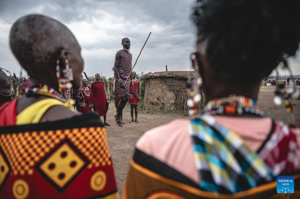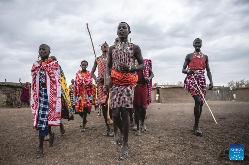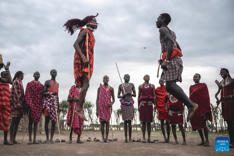 NAROK, 22 agosto, 2024 (Xinhua) -- Imagen del 21 de agosto de 2024 de aldeanos masái interpretando la danza tradicional en una aldea en la Reserva Nacional Masái Mara, en Narok, Kenia. Los masái, una de las principales tribus de Kenia, se encuentran principalmente dispersos en las partes sur y suroeste fronterizas con Tanzania. La tribu todavía vive de manera nómada. Su asentamiento cubre los destinos turísticos mundialmente famosos de la Reserva Nacional Masái Mara y el Parque Nacional Serengeti. Con el desarrollo de la industria turística local, el pueblo masái ha abierto sus aldeas para recibir a los turistas, como una forma de aumentar sus ingresos mientras mantiene su estilo de vida tradicional. (Xinhua/Wang Guansen)