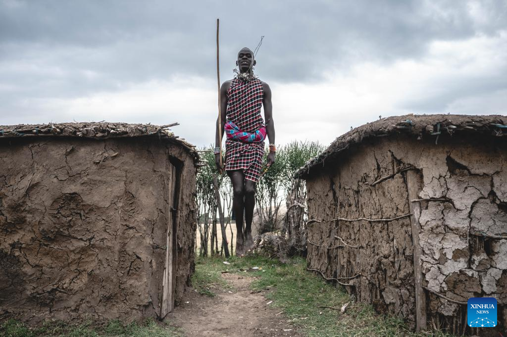 NAROK, 22 agosto, 2024 (Xinhua) -- Imagen del 21 de agosto de 2024 de un aldeano masái interpretando la danza tradicional en una aldea en la Reserva Nacional Masái Mara, en Narok, Kenia. Los masái, una de las principales tribus de Kenia, se encuentran principalmente dispersos en las partes sur y suroeste fronterizas con Tanzania. La tribu todavía vive de manera nómada. Su asentamiento cubre los destinos turísticos mundialmente famosos de la Reserva Nacional Masái Mara y el Parque Nacional Serengeti. Con el desarrollo de la industria turística local, el pueblo masái ha abierto sus aldeas para recibir a los turistas, como una forma de aumentar sus ingresos mientras mantiene su estilo de vida tradicional. (Xinhua/Wang Guansen)