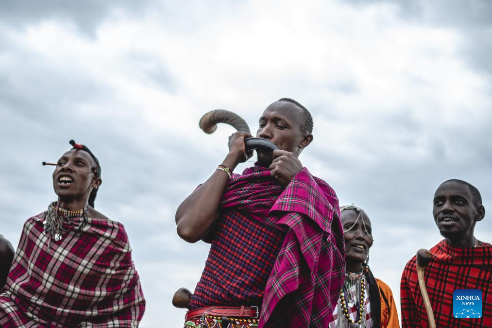 NAROK, 22 agosto, 2024 (Xinhua) -- Imagen del 21 de agosto de 2024 de aldeanos masái tocando instrumentos musicales tradicionales en una aldea en la Reserva Nacional Masái Mara, en Narok, Kenia. Los masái, una de las principales tribus de Kenia, se encuentran principalmente dispersos en las partes sur y suroeste fronterizas con Tanzania. La tribu todavía vive de manera nómada. Su asentamiento cubre los destinos turísticos mundialmente famosos de la Reserva Nacional Masái Mara y el Parque Nacional Serengeti. Con el desarrollo de la industria turística local, el pueblo masái ha abierto sus aldeas para recibir a los turistas, como una forma de aumentar sus ingresos mientras mantiene su estilo de vida tradicional. (Xinhua/Wang Guansen)