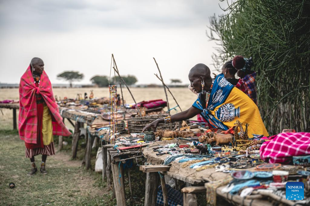 NAROK, 22 agosto, 2024 (Xinhua) -- Imagen del 21 de agosto de 2024 de aldeanos masái vendiendo recuerdos en la Reserva Nacional Masái Mara, en Narok, Kenia. Los masái, una de las principales tribus de Kenia, se encuentran principalmente dispersos en las partes sur y suroeste fronterizas con Tanzania. La tribu todavía vive de manera nómada. Su asentamiento cubre los destinos turísticos mundialmente famosos de la Reserva Nacional Masái Mara y el Parque Nacional Serengeti. Con el desarrollo de la industria turística local, el pueblo masái ha abierto sus aldeas para recibir a los turistas, como una forma de aumentar sus ingresos mientras mantiene su estilo de vida tradicional. (Xinhua/Wang Guansen)
