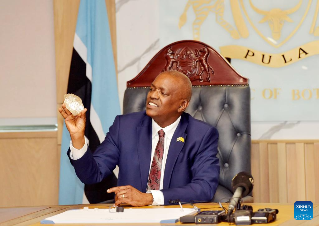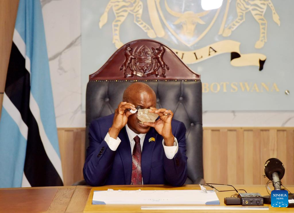 GABORONE, 23 agosto, 2024 (Xinhua) -- Imagen del 22 de agosto de 2024 del presidente botsuano, Mokgweetsi Masisi, sosteniendo el diamante de 2.492 quilates descubierto en la Mina de Diamantes de Karowe en el centro-norte de Botsuana, en Gaborone, Botsuana. El descubrimiento de un diamante de 2.492 quilates fue anunciado por Lucara Diamond Corp. el miércoles. Fue el diamante más grande jamás descubierto en Botswana y el segundo más grande del mundo. (Xinhua/Tshekiso Tebalo)